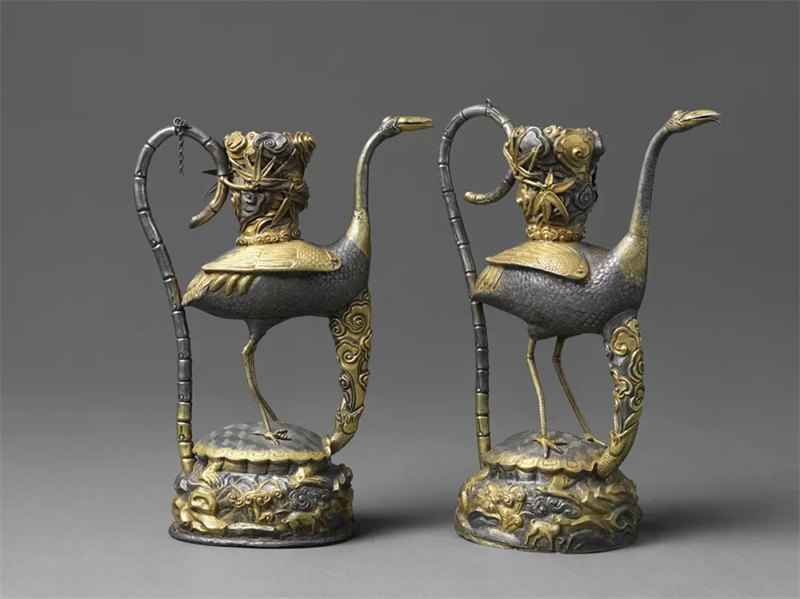 热情好客的藏族有着悠久的酒文化,酒具多有美好的寓意,万年龟和长寿仙鹤的组合,更是将这种巧思发挥到极致。这对执壶是盛酒器物,是清朝皇帝赐予布达拉宫的礼品。仙鹤在上,万年龟在下,龟吐祥云,具有万寿无疆的美好寓意。