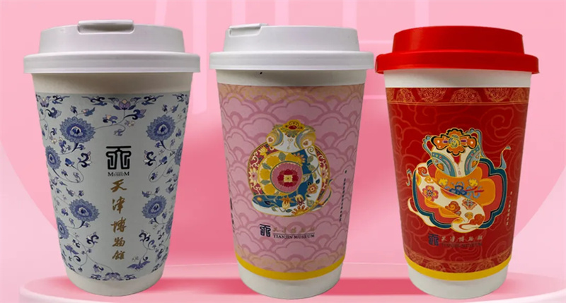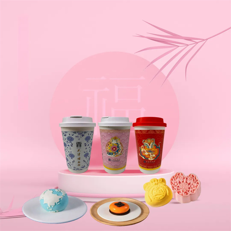 除新品蛋糕外,咖啡厅的纸杯换上了新的“外衣”,有青花缠枝莲纹纸杯,以馆藏青花缠枝莲纹葫芦瓶为灵感设计制作,纹饰清新淡雅,搭配同款UV转印贴纸的文创产品更显活力。蛇元素图案纸杯则以蛇为主题,搭配馆藏文物“竹簧银锭式盒”和“彩秀堂款粉彩吉祥如意盘”设计独特,蛇盘如意的画面充满了新年的气息。