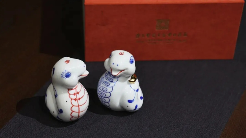 此系列文创产品设计灵感源自馆藏器物清竹簧银锭式盒、清粉彩童戏图如意以及馆藏古钱币元祐通宝,设计师将美好的祝愿与蛇元素相互结合,碰撞出别样的效果。