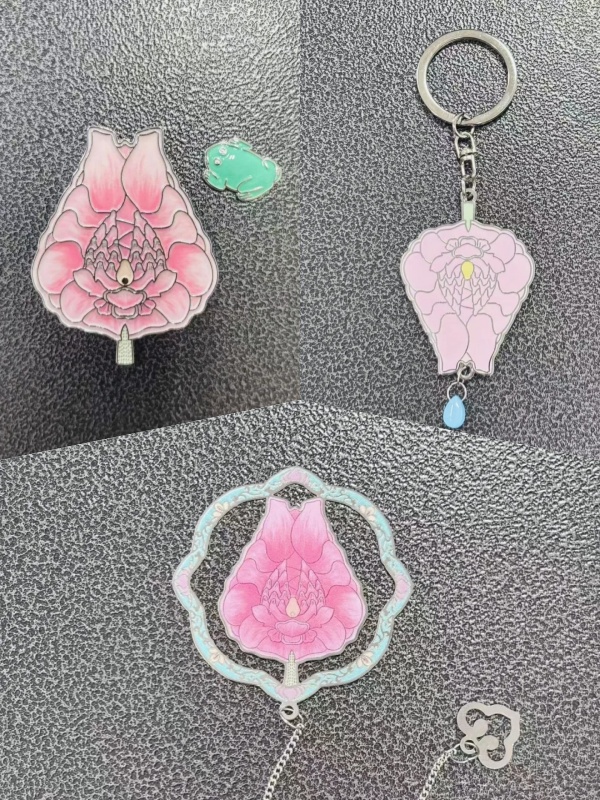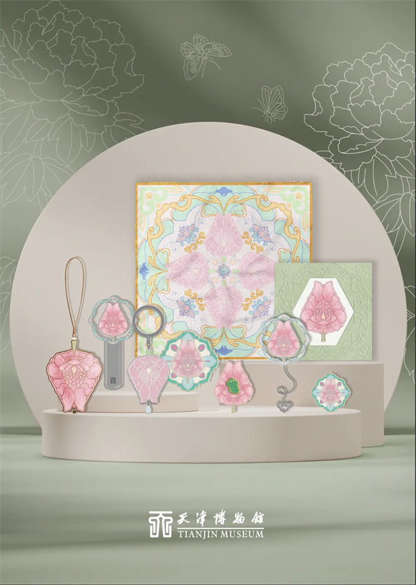 此系列产品原型为馆藏清光绪粉彩花卉形秋操吸杯,杯体是船型的牡丹花式样,杯底有一孔,通过细长的花梗引到上面做吸管用,花梗的背面印有 “大清光绪三十四年安徽太湖附近秋操记念杯”字样。设计师以秋操吸杯为灵感将现代工艺与之相结合,创作出冰箱贴、钥匙扣、书签、丝巾等产品。