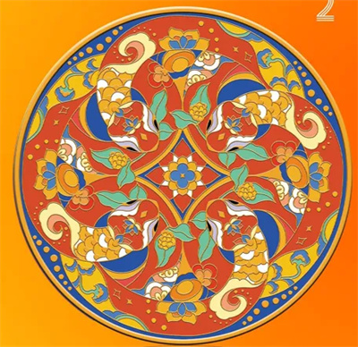 金蛇衔财——整体采用铜钱构图,主体采用四只金蛇首尾相衔,寓意财富生生不息,缠绕方式参考吉祥结纹样,寓意吉祥如意。