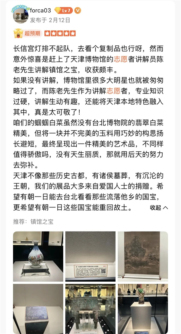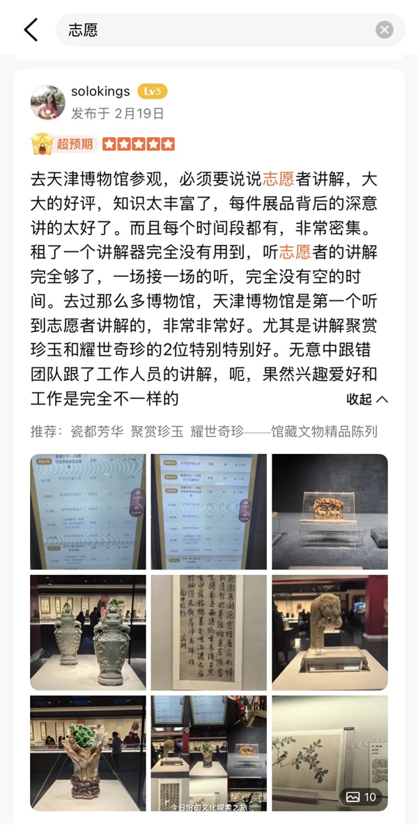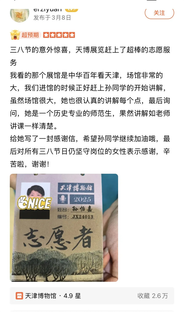 在天津博物馆的每一角落,除了珍贵的文物诉说着历史的故事,还有一群默默无闻却至关重要的身影,他们便是天博的志愿者们。2025年是天津博物馆志愿者团队成立二十周年。在二十年的岁月里,他们用热情与专业,为每一位访客的参观之旅增添了无限色彩。今天,让我们一起聆听观众们的真挚心声,感受那些被天博志愿者温暖以待的瞬间。以下是部分观众的留言精选,让我们一同见证这份来自心底的赞扬与感激。