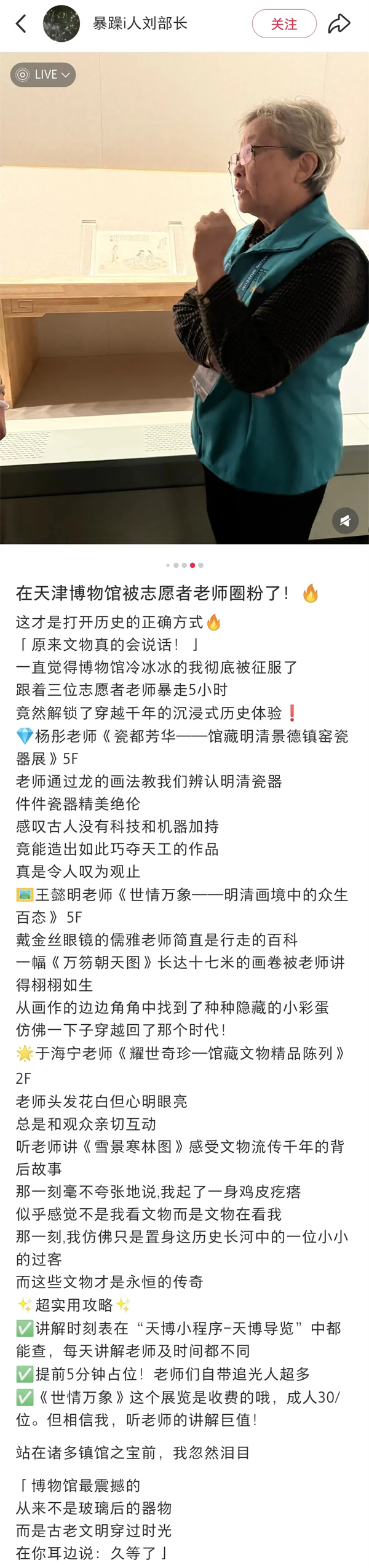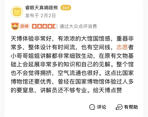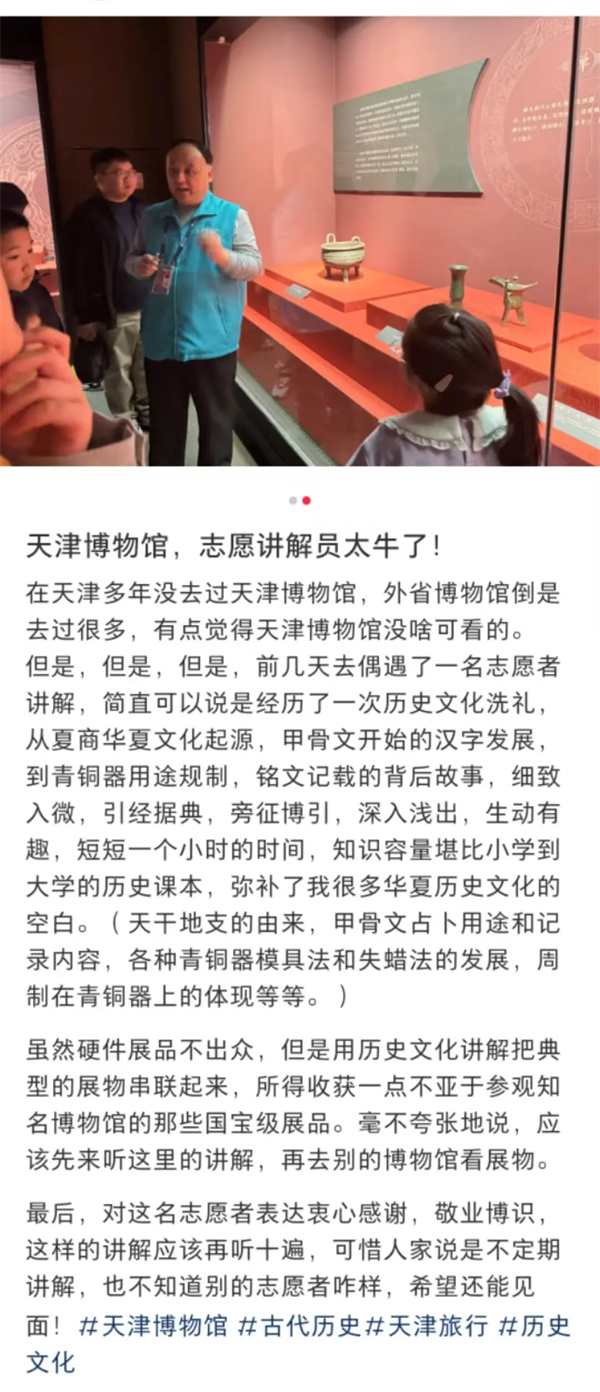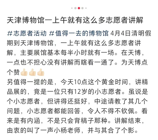 观众们也表达了对天博志愿者讲解安排的喜爱,表示志愿者老师讲解内容深入浅出、生动有趣,引人入胜。