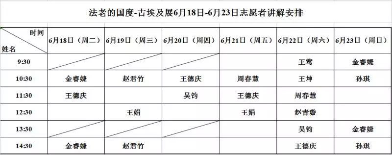 为给广大观众带来更好的参观体验,我馆组织志愿者长期提供公益讲解服务。应广大粉丝要求,提前获取临时展览具体讲解时间,现将6月18日至6月23日志愿者讲解安排公布于下。