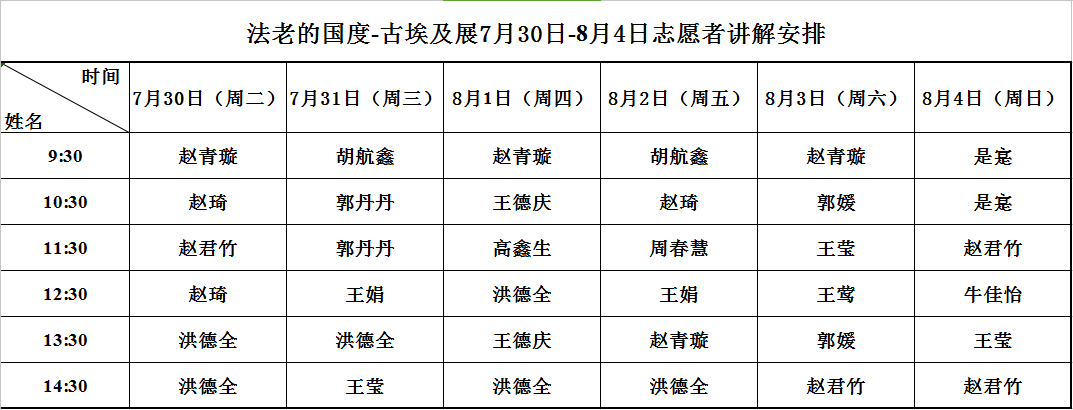“法老的国度”展览开展以来,参观人群络绎不绝,日参观人数屡创新高,天博志愿者的讲解服务也广受观众好评。7月70日至8月4日,天津博物馆将继续为广大观众提供临时展览公益讲解服务。本期公益讲解主要围绕“法老的国度——古埃及文明展”开展。