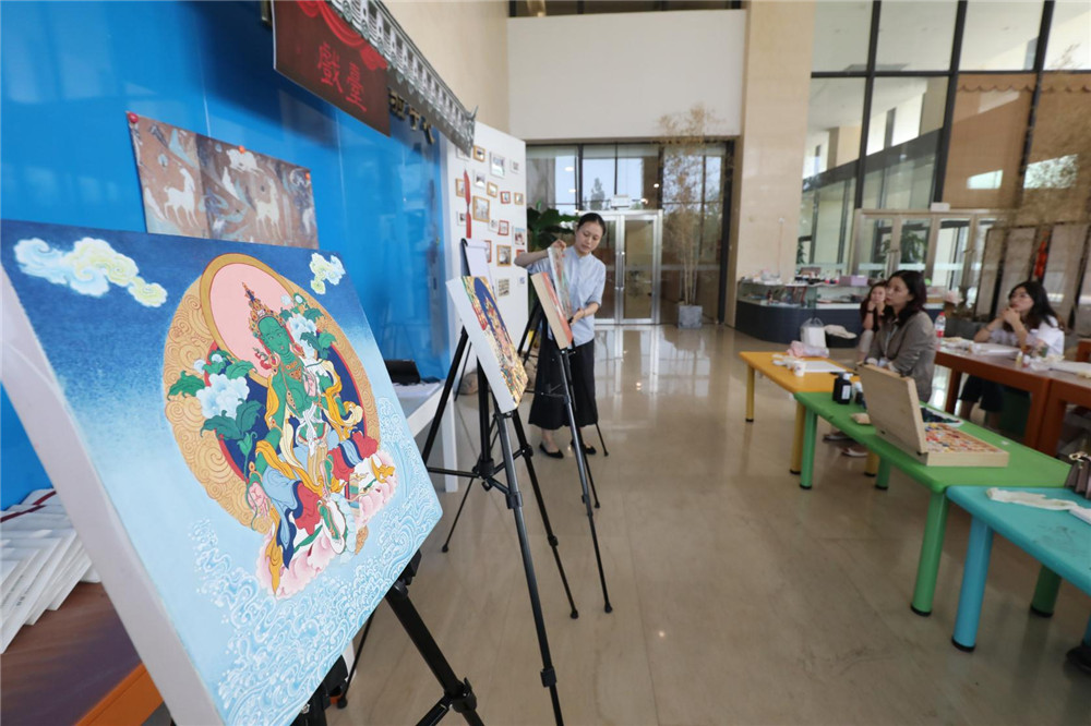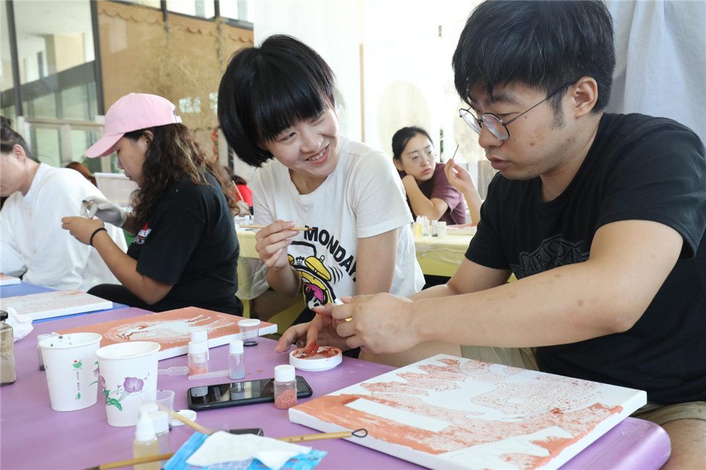 在老师的指导下,大家分别选用合适的矿物颜料色,使用薄涂的技巧,按照提前画好的白描稿勾画出自己心目中九色鹿的壁画图案。