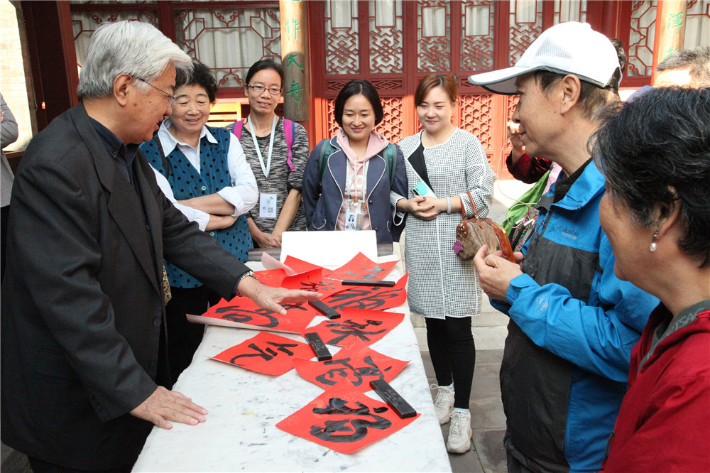 10月7日上午,书法家曹柏崑先生莅临李叔同故居纪念馆,带领天津博物馆的志愿者和天津书法爱好者们研习书法,现场每人都一展身手,有的写“福”,有的写“寿”还有的写“秋高气爽”,曹老师在一旁不住点头称赞。老师在对大家的字逐一进行点评后,为到场观众剖析了弘一大师的书法造诣和书法底蕴,指点大家如何欣赏大师的书法作品。经曹老的讲解,在场观众了解了修习书法的法度,提升了书法鉴赏能力。临别,曹老以“福”字赠予在场众人,现场其乐融融。