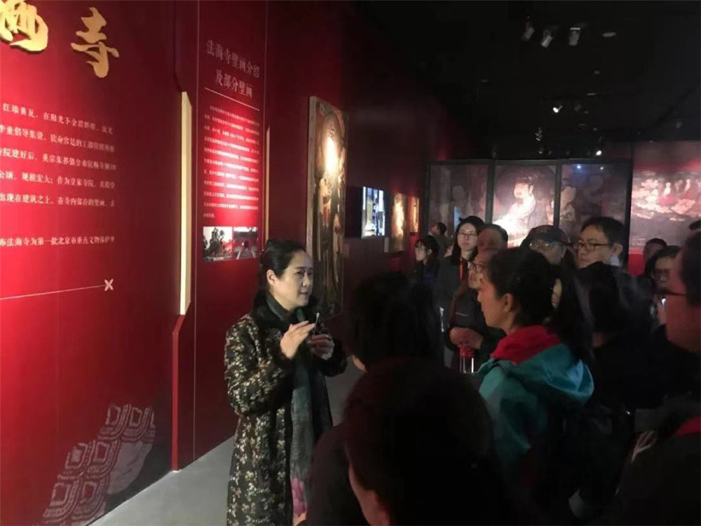 10月26日,北京法海寺文物保管所业务部主管徐柯、志愿者陆晓岩,石家庄“毗卢寺壁画的女儿”武育红亲临天博,为观众讲解“粉壁丹青——京津冀古代经典壁画艺术展”中法海寺、毗卢寺的壁画精品。
