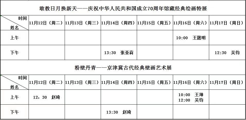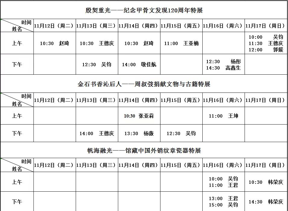 本周,天津博物馆继续安排经过专业培训、考核上岗的志愿者队伍,为观众分时段进行公益讲解,安排如下图所示。