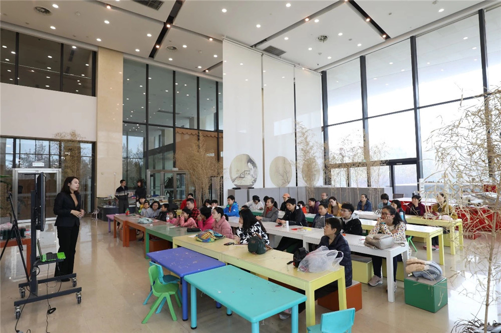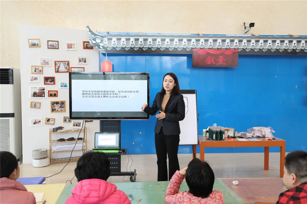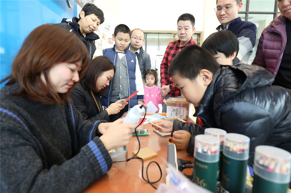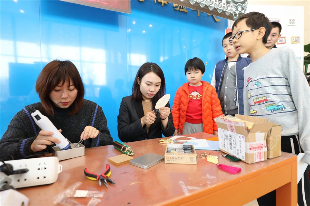 本周六,天津博物馆的社教老师们带领来参加活动小朋友们使用热缩片制作属于自己姓氏的甲骨文名牌。大家先是用甲骨文字典,仔细查找属于自己姓氏的起源及字形演变,接着在老师发给大家的热缩片上描摹出字符。经过热风机吹缩后,挂上穗子,一个专属自己的甲骨文名牌就做好了!