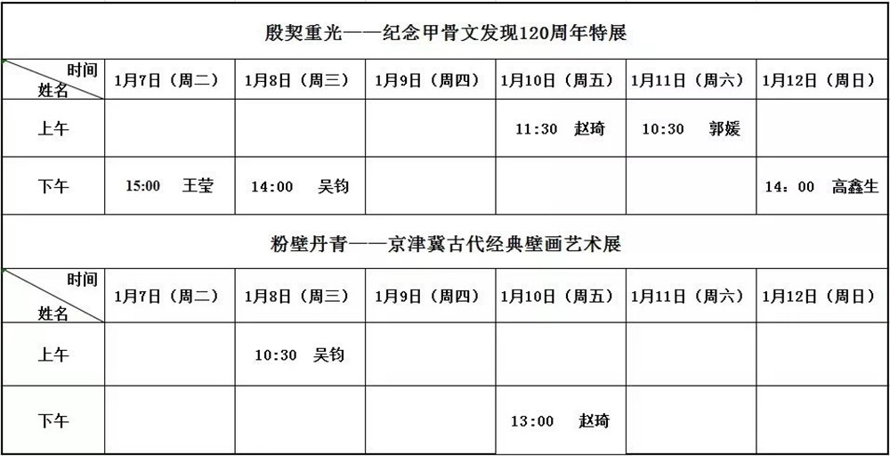 “敢教日月换新天——庆祝中华人民共和国成立70周年馆藏经典绘画特展”、“殷契重光——纪念甲骨文发现120周年特展”、“金石书香沁后人——周叔弢捐献文物与古籍特展”、“粉壁丹青——京津冀古代经典壁画艺术展”自开展以来,受到广大观众的好评,为带给大家更好的观展体验,现将2020年1月7日—2020年1月12日的志愿讲解安排公布于下,请大家根据自身情况合理安排参观时间,文明有序参观。