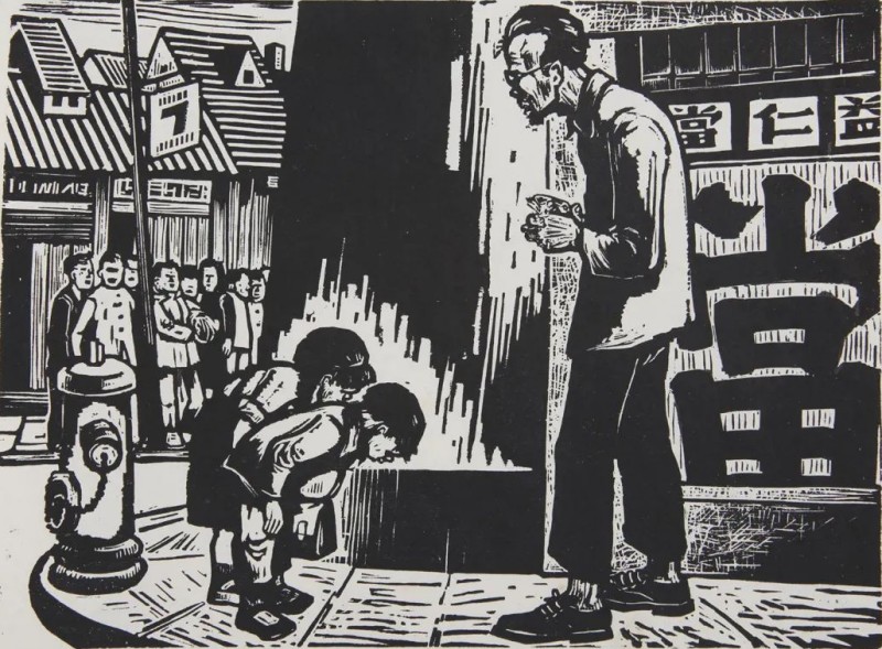 《为了米》 黑白木刻 15.1cm×22.5cm 汪刃锋 1948年