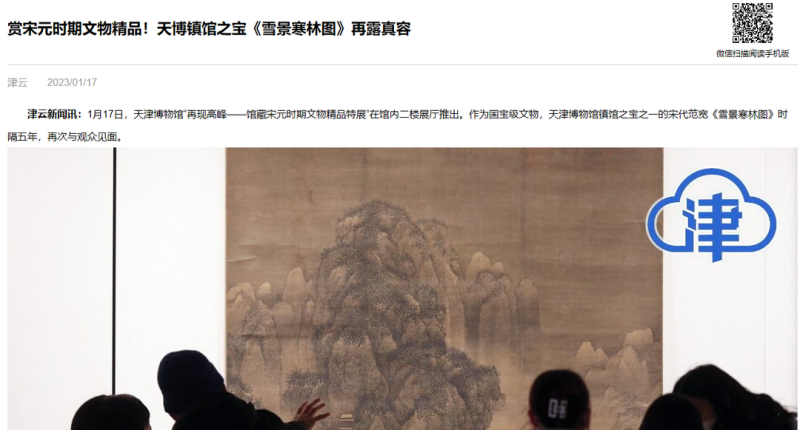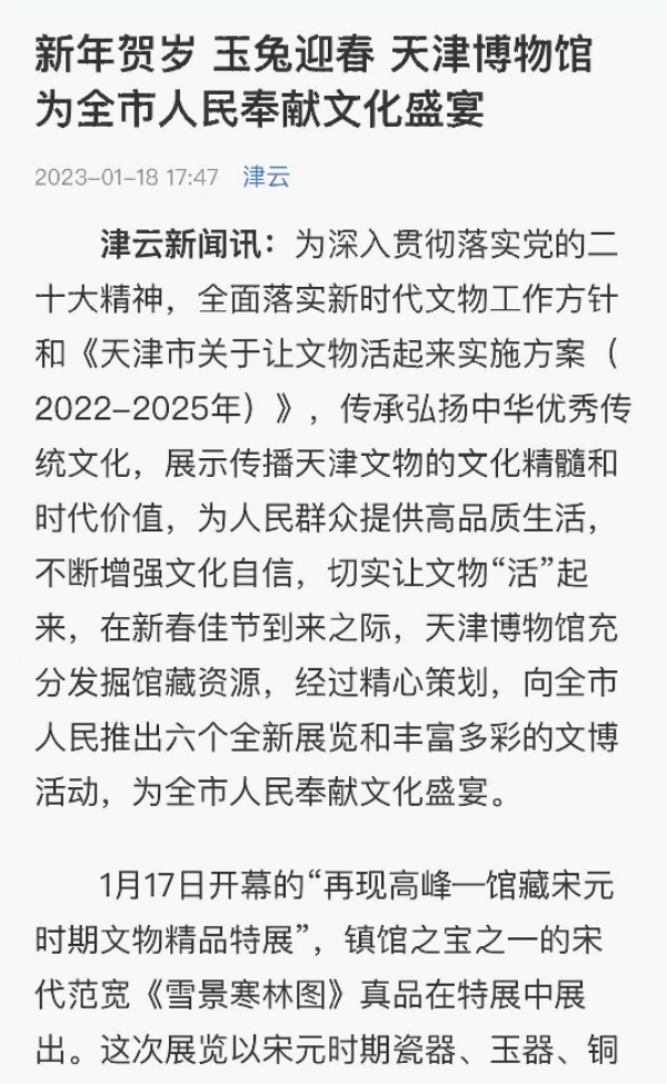 津云 | 1月18日,津云发布报道《赏宋元时期文物精品!天博镇馆之宝<雪景寒林图>再露真容》、《新年贺岁 玉兔迎春 天津博物馆为全市人民奉献文化盛宴》。