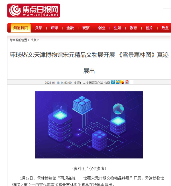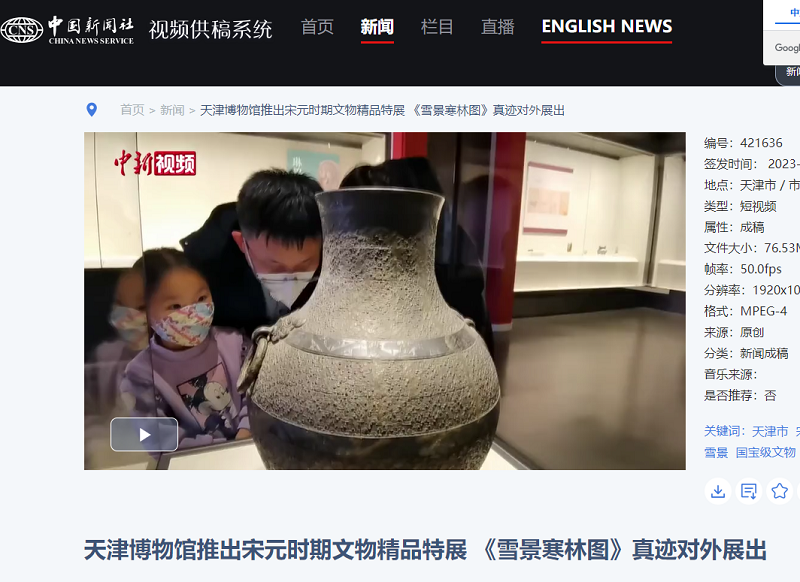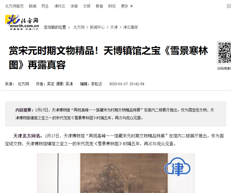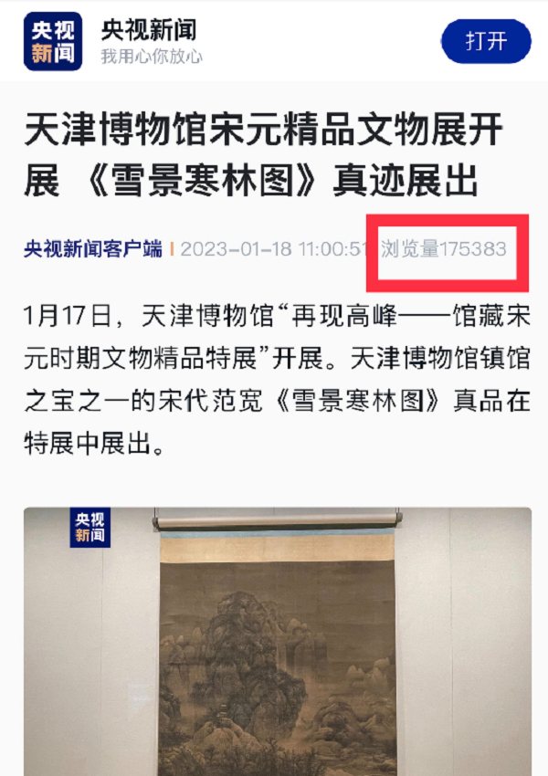 央视新闻客户端 | 1月18日,央视新闻客户端刊发《天津博物馆宋元精品文物展开展,<雪景寒林图>真迹展出》,文章发布一经发布,浏览量迅速达到175300余次。