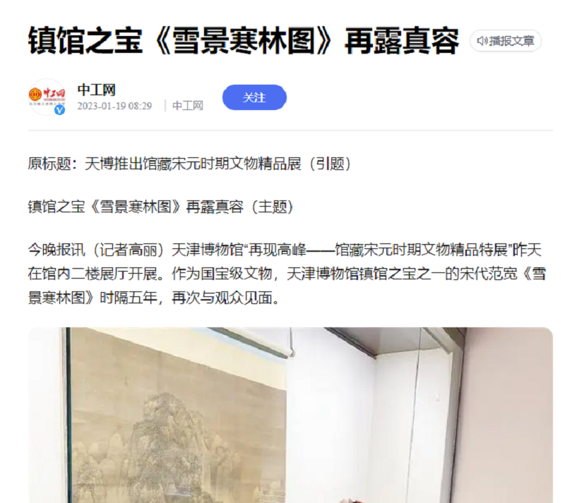 中工网 | 1月18日,中工网发布文章《镇馆之宝<雪景寒林图>再露真容》。