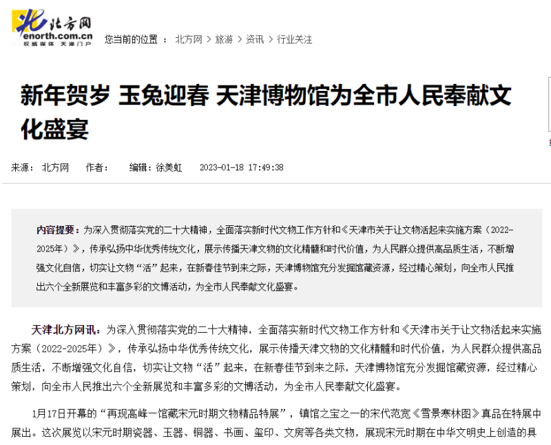 北方网 |1月18日,北方网发布文章《赏宋元时期文物精品!天博镇馆之宝<雪景寒林图>再露真容》和《新年贺岁 玉兔迎春 天津博物馆为全市人民奉献文化盛宴》。