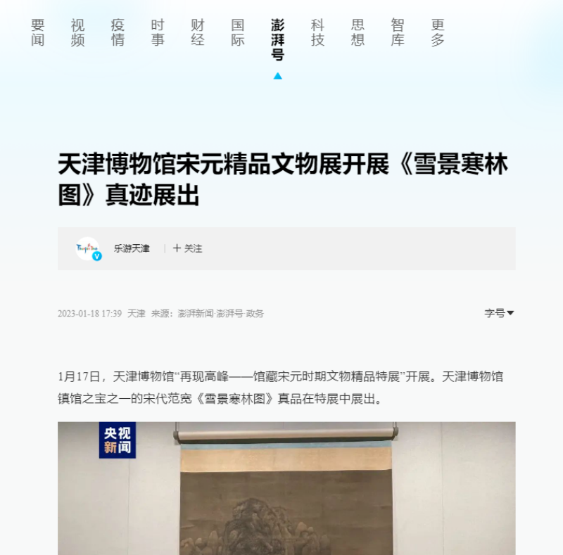 澎湃新闻 | 1月18日,澎湃新闻发布《天津博物馆宋元精品文物展开展<雪景寒林图>真迹展出》。