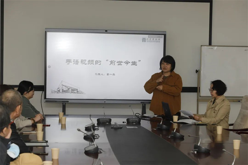 随后,图像信息部的王浩和董一晶对天津博物馆手语讲解服务工作进行了介绍,天津博物馆副馆长、天津美术馆馆长马驰说,天津博物馆是一座历史艺术类综合性博物馆,文博手语研究培训项目是天津市首家开展的创新型项目,天津博物馆和京、津两地聋人协会可利用自身优势,将文博手语的研究与培训推广到全国。