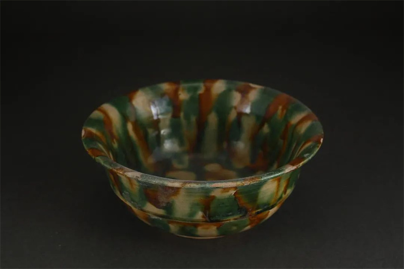 三彩碗色泽艳丽,轮制而成,造型规整而别致。其腹部有凸棱一周,与何家村唐代窖藏出土的折腹银碗造型风格相类似。这种造型具有明显的西域风格,是唐代工匠仿照波斯萨珊朝金银器制作而成的。初唐时,折腹器沿丝绸之路东来,并对我国的陶瓷金银器物产生了深远的影响。