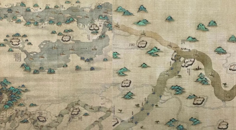 《清乾隆漕运图》,右起北京,左至杭州,画卷采用平立面结合的鸟瞰式形象画法,地图方式描绘了漕运水道路线,以及沿途的城市、山脉、河流、湖泊等地理景致。整幅图卷绘画精细、内容详尽,所以放眼望去,从南到北,整个漕运的情景都能一览无余,甚至是船只都能看得清清楚楚,无不体现出清代的地图绘画艺术和制图水平,为研究漕运文化、运河文化的发展提供了历史佐证。