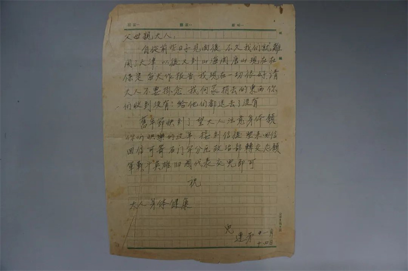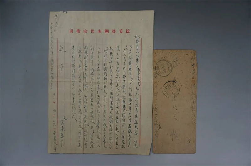 我们的工作已完成,明天就要离开北京,回朝鲜前线了。因为时间仓促,路过天津也不能回家看望你们。我现在一切都很好,请大人放心,等我回到朝鲜工作岗位,马上来信,别不再谈,望大人保重身体。