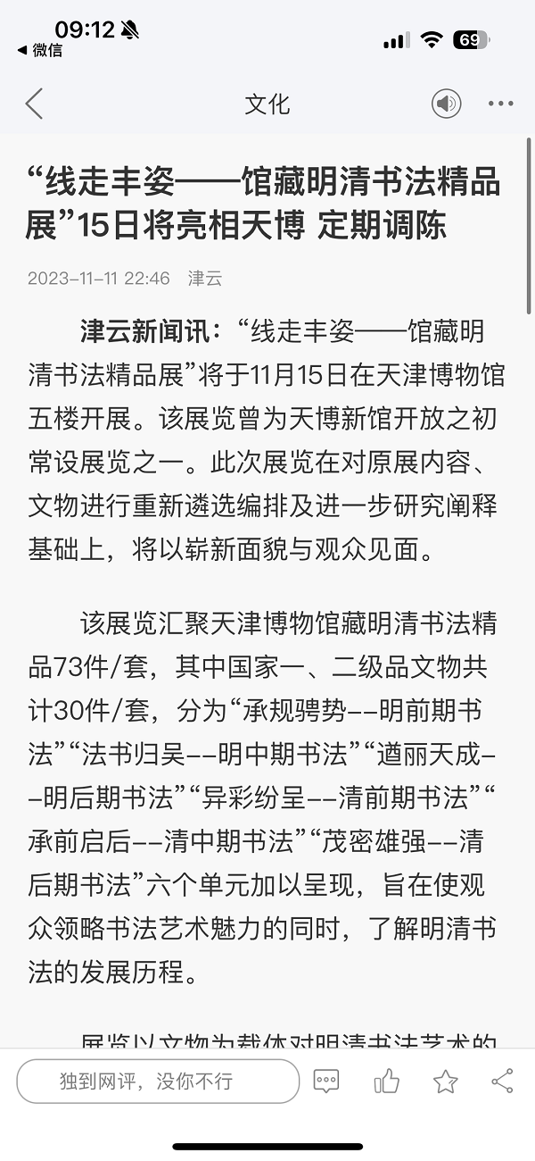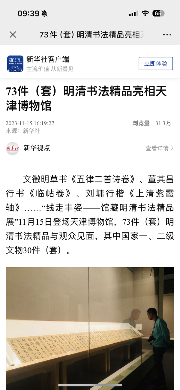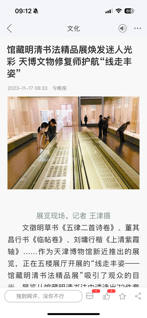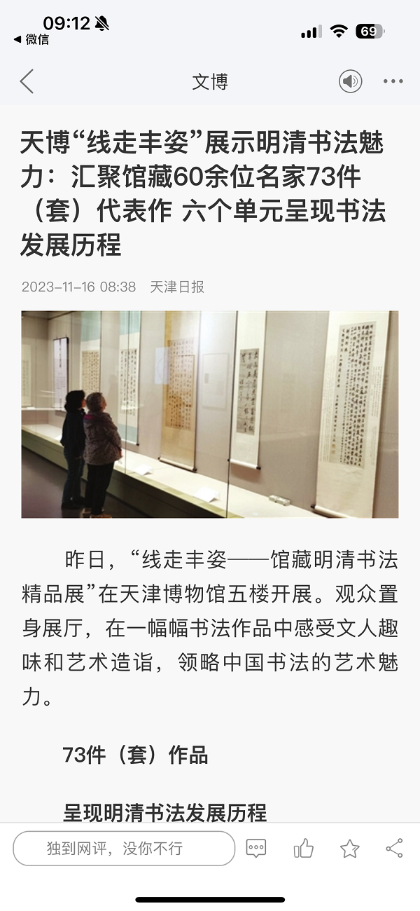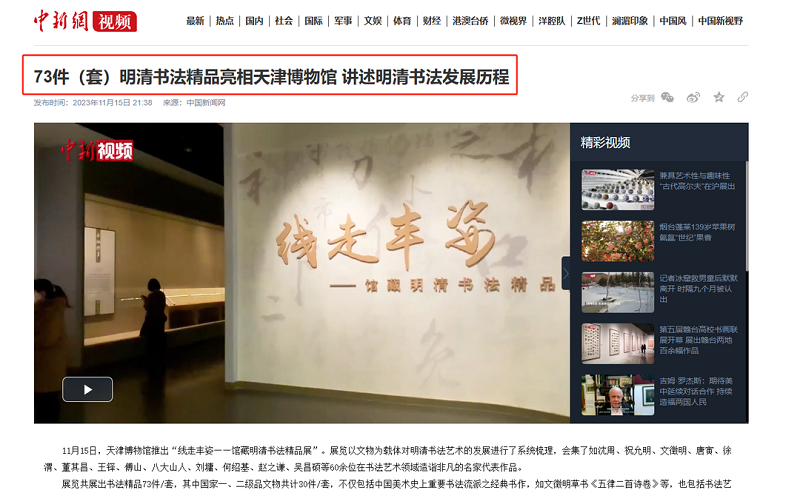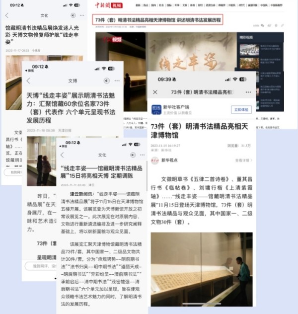“线走丰姿——馆藏明清书法精品展”开展以来,得到了新华社、中国新闻网、天津日报、今晚报、津云等多家媒体聚焦关注、宣传报道。其中,新华社《73件(套)明清书法精品亮相天博》阅读量已达32.2万,获得广泛传播,影响力较大。