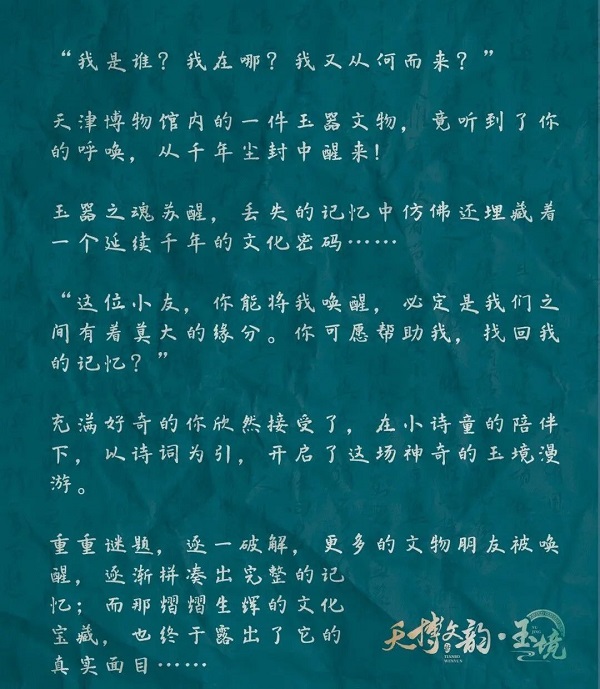 “天博文韵·玉境”项目,设置剧情解谜主线、真人NPC诗词互动支线、文创礼品收集、文物与诗词知识讲解、博物馆网红地标打卡等丰富玩法。