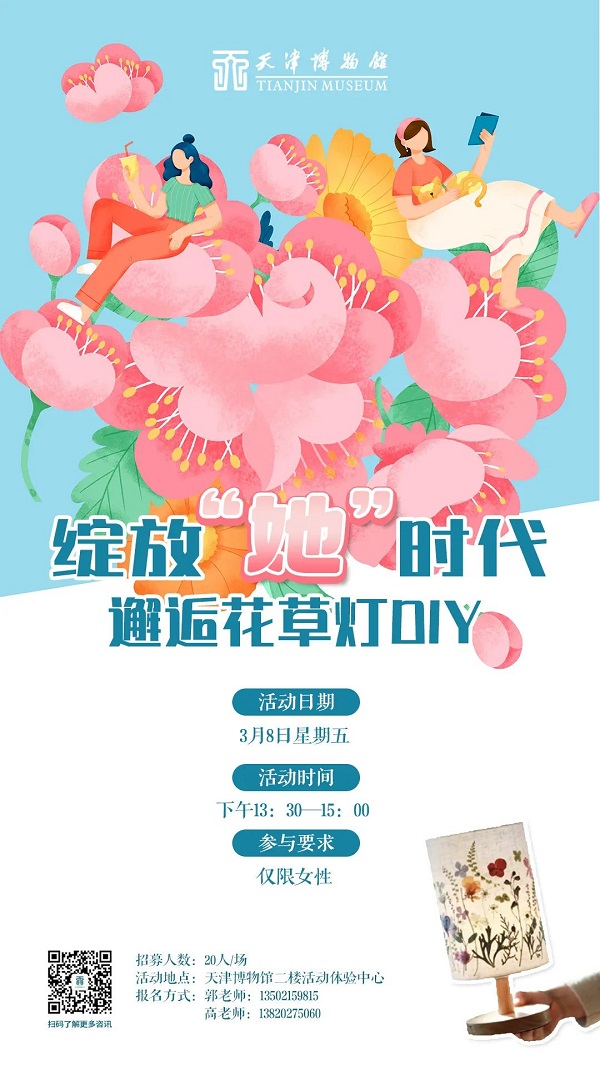 在春日百花盛开之际,天津博物馆特别策划《绽放“她”时代 邂逅花草灯DIY》女神节特别活动,通过现场制作花草装饰灯、品花草茶等体验环节,让您放松身心缓解身体疲劳,感受属于春天那诗意般的小美好,品味专属于女神们的优雅休闲时光吧!