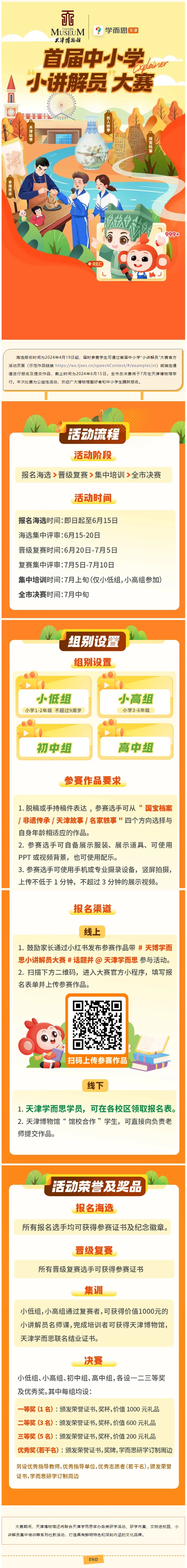 为深入学习贯彻落实习近平总书记视察天津重要讲话精神,坚持以文化人、以文惠民、以文润城、以文兴业,努力在文化传承发展上善作善成,天津博物馆启动首届中小学“小讲解员”大赛。该项活动旨在传承发展城市文化,深入发掘历史文化资源,培养广大青少年对中华传统文化的认同感,让更多青少年走进博物馆,讲好天津故事、讲好中国故事。活动由天津文物和博物馆学会指导,天津博物馆和天津学而思联合主办,2024年4月至7月,为期3个月。赛事采用海选、复赛、全市总决赛三级赛制,设置国宝档案、非遗传承、天津故事、名家轶事四条赛道,面向全市中小学生,设置小低组、小高组、初中组、高中组四个组别,各组分设一、二、三等奖及优秀奖,另设优秀指导教师,优秀指导单位,优秀志愿者等奖项。