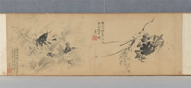 画家不拘泥于形似,而是以狂草、泼墨之法直接绘出物象,用笔纵意狂放,水墨淋漓,构图简洁。整卷以物托志,寓意深远,耐人寻味。