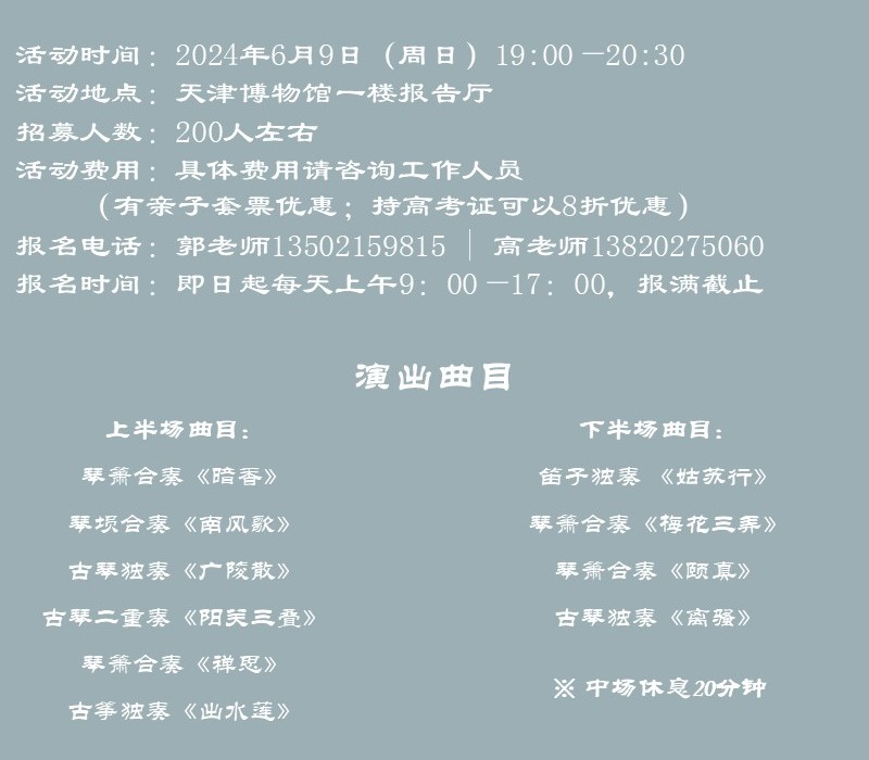 此次古琴赏析会还邀请了重量级的演奏家加盟,嘉宾包括天津音乐学院教授、中国琴会副会长、中国昆剧古琴研究会古琴专业委员会副主任李凤云,天津音乐学院教授、音乐学系主任、中国传统音乐学会理事、笛箫演奏家、音乐理论家王建欣等,相信他们的精彩演奏一定会为让您度过一个美好的博物馆之夜。