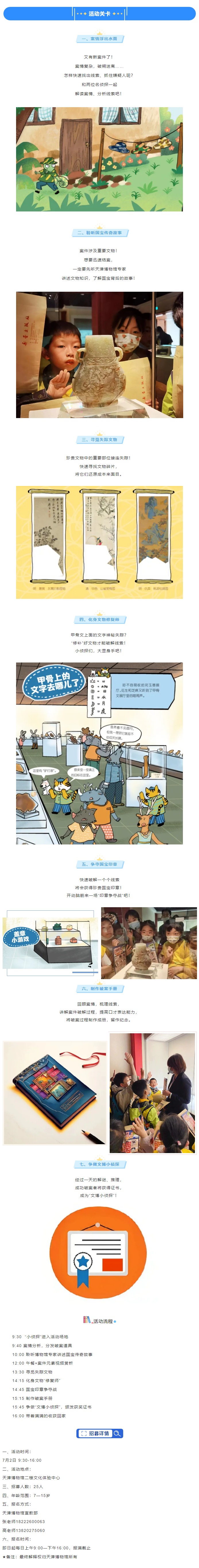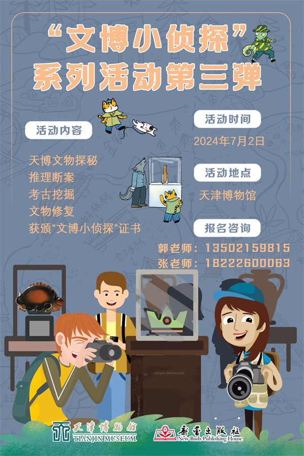 “探秘‘文物追踪记’ 做文博小侦探”一日营活动是以天津博物馆与新蕾出版社共同打造的《博物馆追踪记》图书为灵感,合作设计并推出的线下文物解密活动。其中,既有沉浸式的角色扮演,又实现了现实与历史的串联,无疑吸引众多文博爱好者驻足,丰富有趣的体验形式更是获得了家长和小朋友们的喜爱!那么就让我们在这个炎热的暑假,再次相约在天津博物馆,共同体验国宝传奇故事,过一把破案的瘾吧!