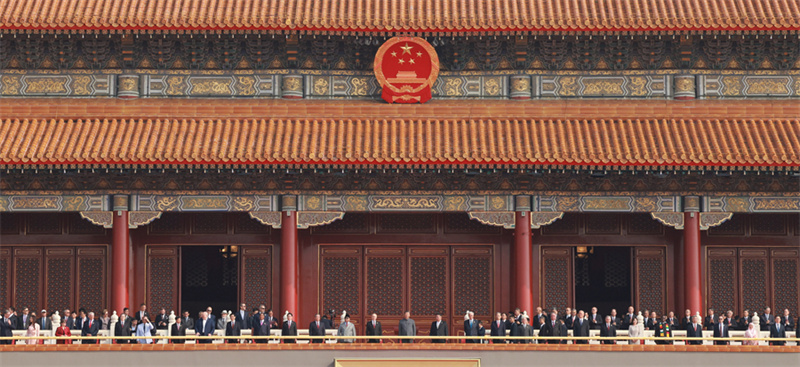 8时55分,习近平等中外领导人来到天安门城楼主席台,全场爆发出雷鸣般的掌声。