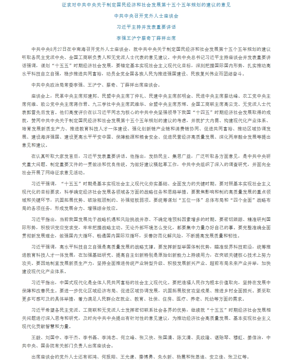 中共中央召开党外人士座谈会 习近平主持并发表重要讲话