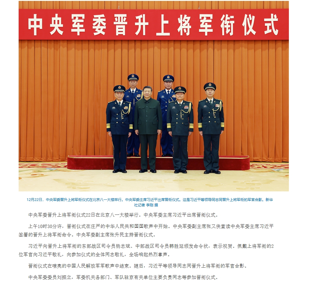 中央军委举行晋升上将军衔仪式 习近平颁发命令状并向晋衔的军官表示祝贺