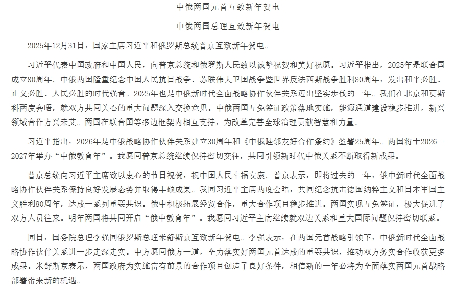 中俄两国元首互致新年贺电
