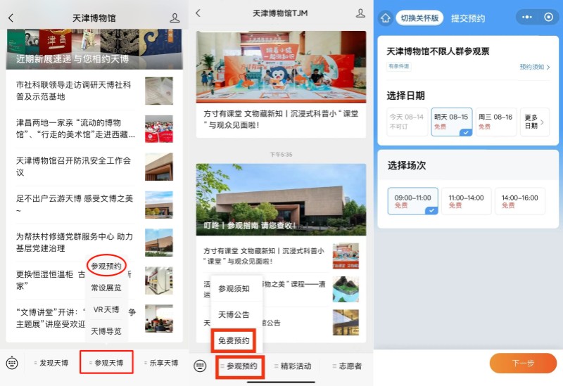 微信关注“天津博物馆”或者“天津博物馆TJM”微信公众号,点击“参观天博”菜单进行预约,选择合适的场次前来参观。