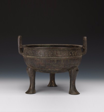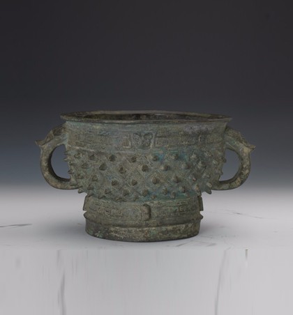 商代 二级 高14.8厘米 口径21.8厘米 口沿微侈,圆腹,两侧置兽首鋬,口沿下饰兽面纹,前后居中各有一浮雕状兽首,高圈足,圈足下有一宽阔的边条。腹部纹饰以斜方格状雷纹为底,其上作百乳,乳钉成尖突状;圈足饰有兽面纹及四道短扉棱。