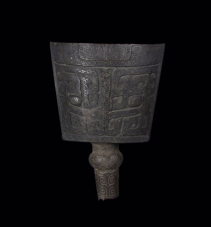 商(公元前1600-前1046) 通高47.5厘米 铙作为一种乐器名,始见于《周礼》,其书《地官鼓人》曰:“以金镯节鼓,以金铙止鼓。”郑玄注:“铙如铃,无舌,有秉,执而鸣之,以止击鼓。”铙形制像铃,但无舌而有中空之柄,属手执敲击...