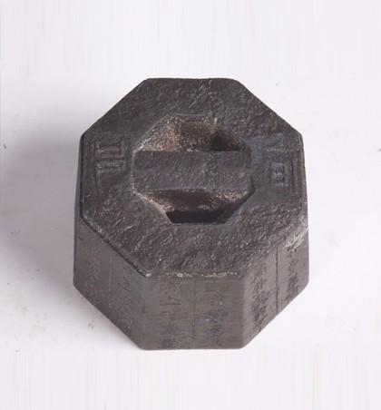 秦(公元前221-前207) 高6.5厘米 口径8.3厘米 底径9.5厘米, 八角棱体,正视截面呈梯形,中空,器顶口有一长方形横梁。横梁左右两侧有阳文篆书“旬邑”,权体八面有秦始皇和秦二世的诏书。诏书书体为小篆,古朴劲健,两诏铭文在秦...