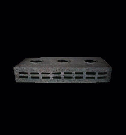 西周(公元前1046-前771) 高23厘米 长126厘米 宽46.6厘米 此件西周夔纹铜禁高23厘米,长126厘米,宽46.6厘米。整体呈扁平立体长方形,中空无底,禁面上有三个微凸起的椭圆形子口,中间的子口略小于两边子口,禁前后两面各有两排镂...