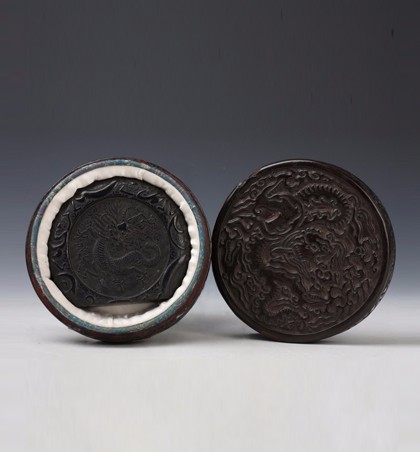 明嘉靖(1522-1566) 直径10厘米 高2厘米 墨作圆形,四周浮雕龙纹,中间篆书阳文“经之墨”,右侧“嘉靖”二字款,背面作团龙纹。此墨下端磨过,从磨过的地方看没气孔,可见其原料细腻,质地缜密,且墨模雕刻精细,虽磨用过仍不失为一...