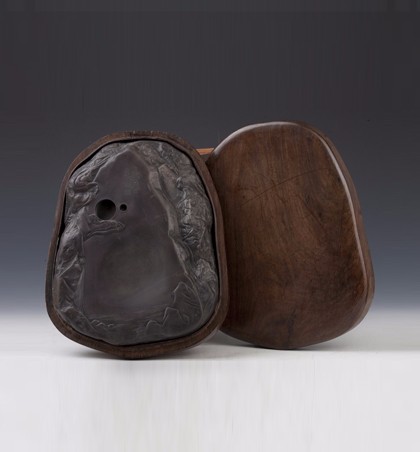 清(1644-1911) 长27.2厘米 宽21.6厘米 高4.5厘米 砚作随形,为老坑石,依石材自然形式,就石皮的凹凸态势琢成赤壁图,砚面中间作砚堂,四周环刻高山流水。砚首正中处镌篆书“高风千古”四字。砚背雕有赤壁泛舟图,并刻有楷书铭文:“...